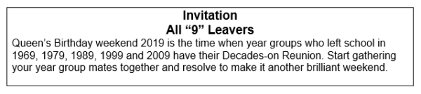 Thanks to the efforts of Dwayne Smith and Richard Sexton in particular, along with others from SMOGA, around 70 past pupils are gathering in Masterton this weekend. The programme includes tours, photographs, drinks in a mystery location, lunch at Rathkeale, an evening at the Masterton Club and a Sunday family picnic in Queen Elizabeth II Park. We wish them well and hope their time capsule buried at School House can actually be found!